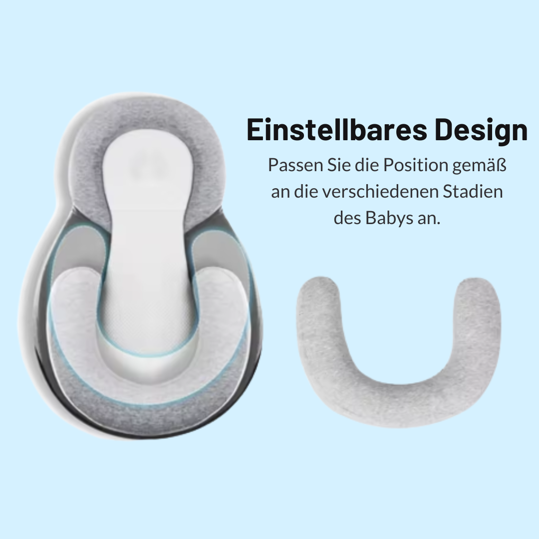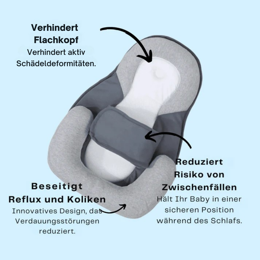Dank seiner speziellen Form und erhöhten Rändernbietet das DreamNest™ nicht nur Geborgenheit, sondernunterstützt die natürliche Kopfformdeines Babys und hilft dabei,Plattkopf-Syndrom (Flat Head) zu vermeiden. Die leicht erhöhte Liegefläche reduziertKoliken und Reflux, sodass dein Baby ruhiger schläft – und du auch.