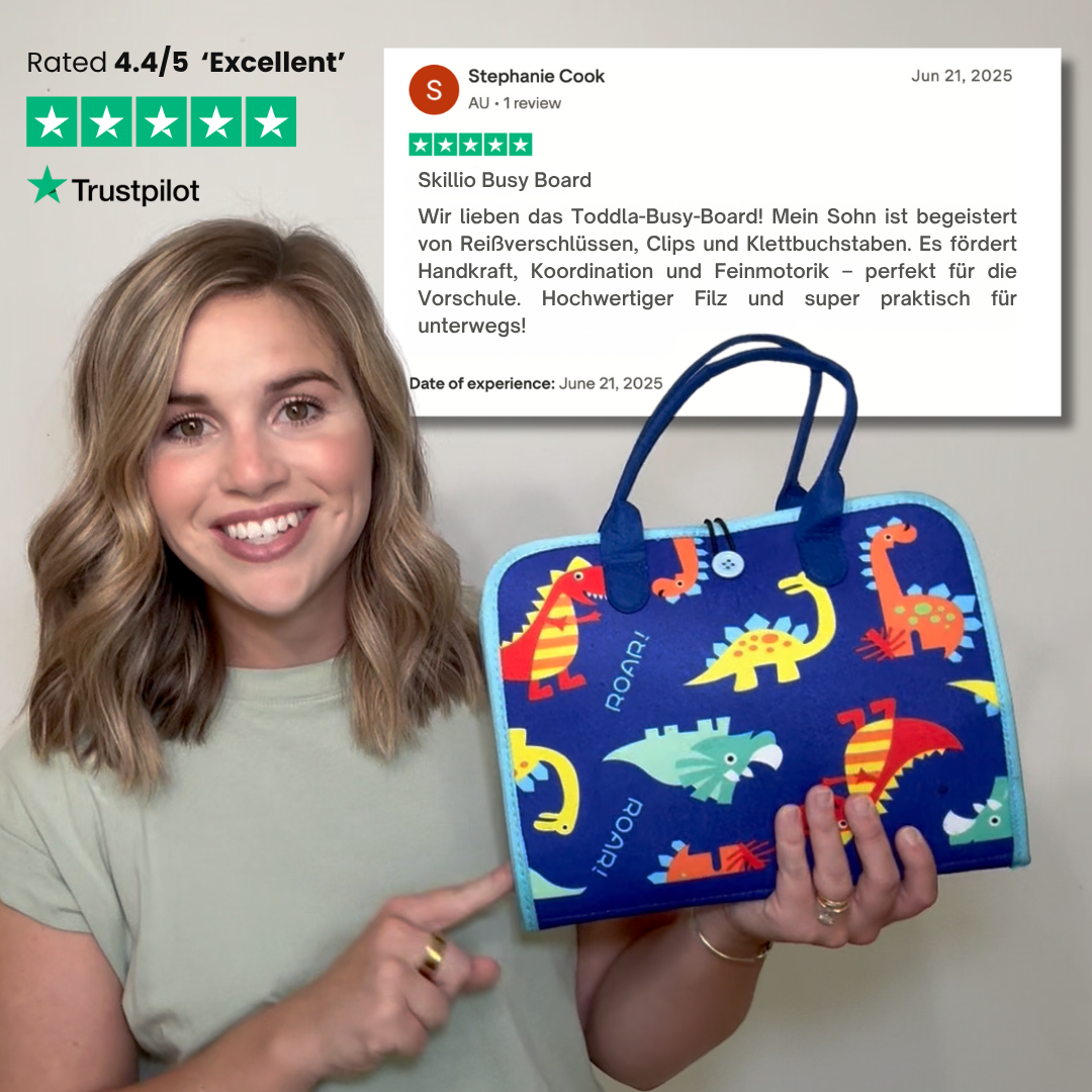 Mit echten Knöpfen, Schnallen, Reißverschlüssen und Schnürsenkeln verwandelt das Skillio™ Montessori Busy Board das Spielen in gezieltes Lernen. Inspiriert von den Montessori-Prinzipien fördert es die Feinmotorik, Hand-Auge-Koordination und Problemlösungsfähigkeiten – und legt damit den Grundstein für Selbstständigkeit und Selbstvertrauen, die ein Leben lang halten.